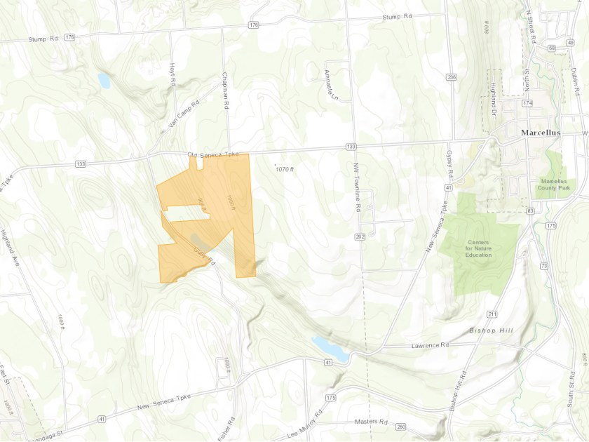 The Skaneateles Conservation Area and transfer station properties are shown in orange. The larger area in green is Baltimore Woods, which is just downwind of the SCA, making it susceptible to air-born invasive propagules from the SCA and transfer station.