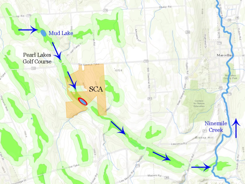 Previous Image Next Image Phragmites area-10 The water then flows into Ninemile Creek, which originates at Otisco Lake to the south.