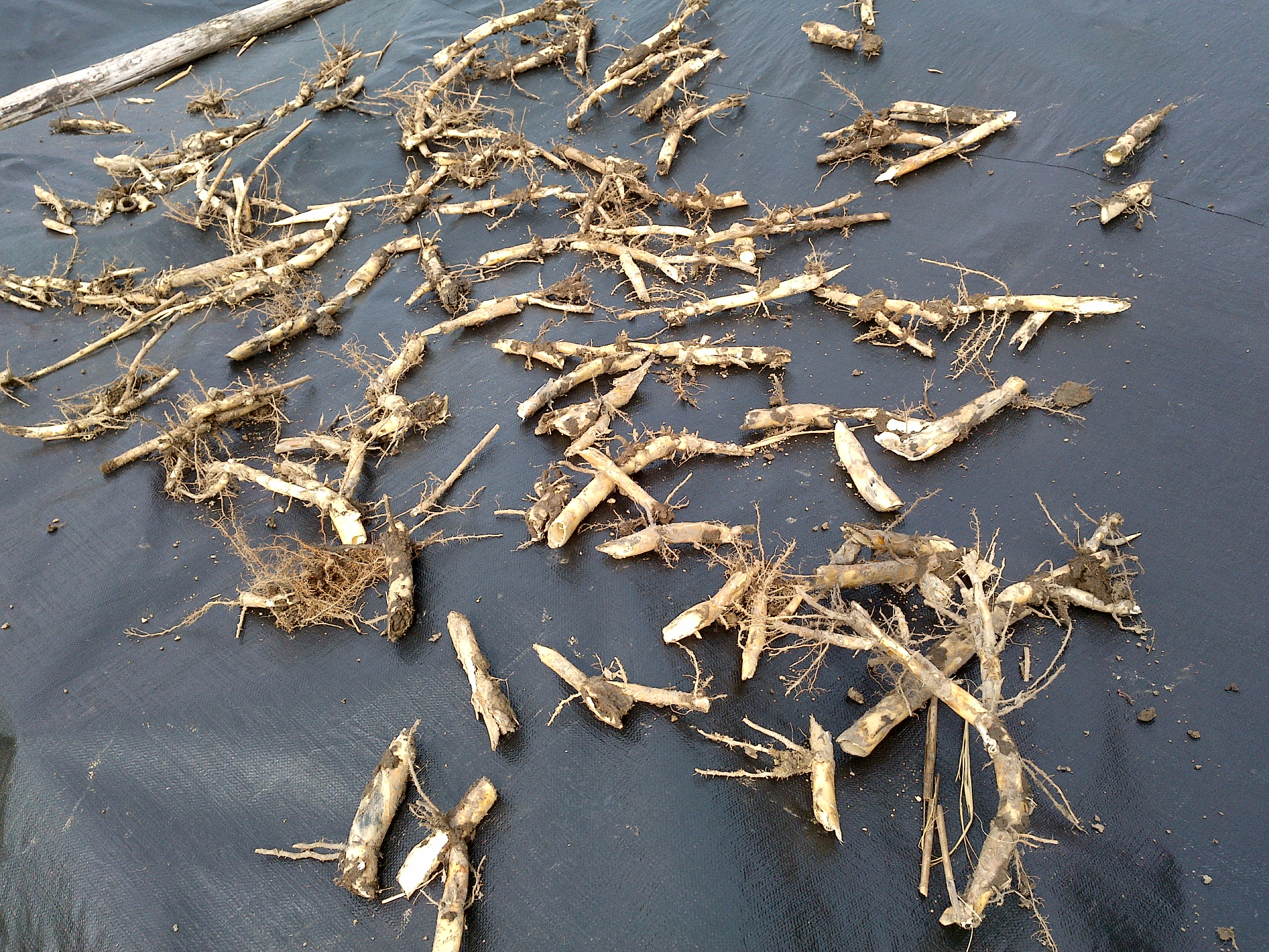 Previous Image Next Image Phragmites 2016-10-16 00128 Oct. 16, 2016. Roots and rhizomes of Phragmites from a test trench in an infestation covered with black tarp during the Summer.