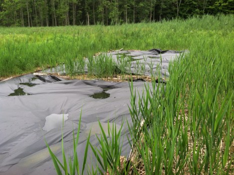 Previous Image Next Image Phragmites 2016-07-31 1386 July 31, 2016. Phragmites growth after one month. Tarps had shrunk from the heat.