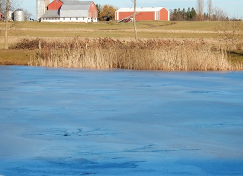 Next Image Phragmites 2014-12-26 0370-72 Dec. 26, 2014. Phragmites australis in in the fishing pond. Facing east toward the Masters farm. This was removed by the Highway Department the following spring using an excavator.