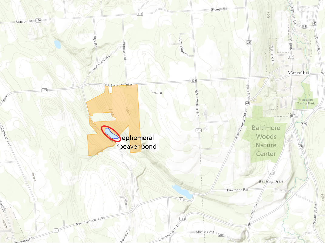 The Phragmites infestations surround an ephemeral beaver pond, whose existence depends on occasional beaver activity and the absence of Phragmites. These plants will form a dense monoculture that will exclude most other flora and fauna.