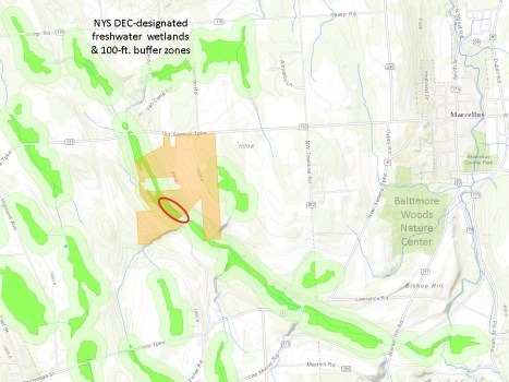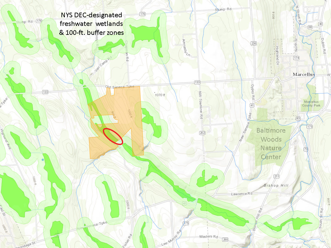 The Phragmites stands of concern all lie within a NYS DEC-designated wetland or the 100-ft. buffer zone. This will require that a freshwater wetland permit be obtained for any chemical or other substantial means of treatment.