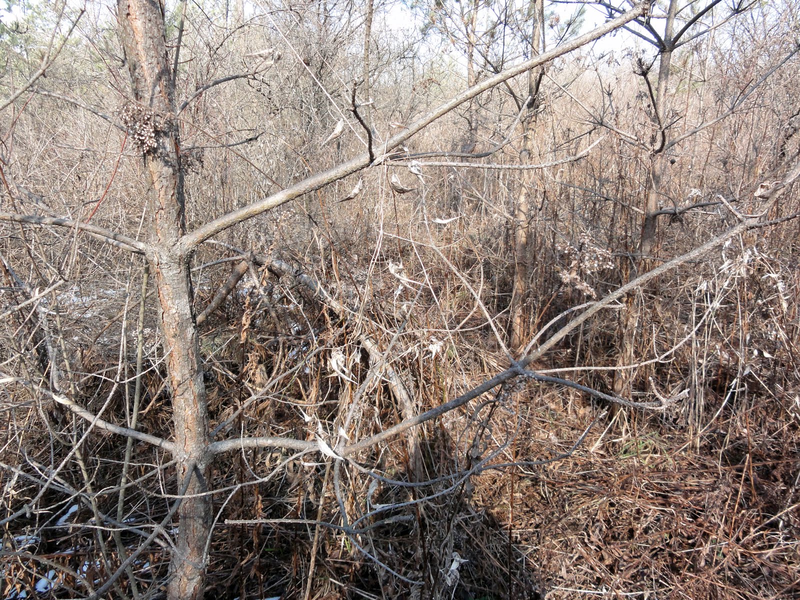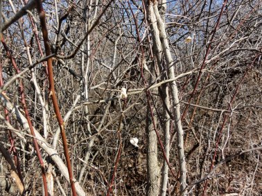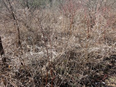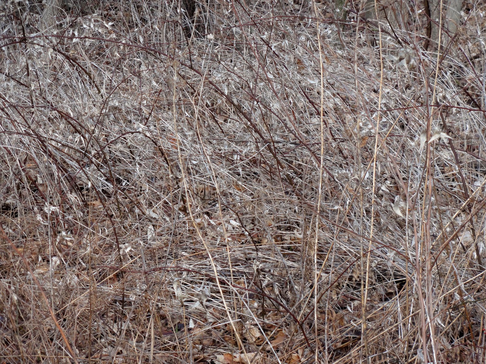 Most of the vines were climbing other exotics, which is not surprising, since they comprise the majority of easily-climbable vegetation in the area. Most were climbing bush honeysuckle, followed by buckthorn, multiflora rose, privet, grape vines, and autumn olive (in very rough order of infestation.) A much smaller, but still subtatntial number of vines were climbing native plants, primarily the gray- and red-stemmed dogwoods, but also a couple of small pine trees. There was also an area of bramble (where the group of pins are at the bottom of the map) that has a very dense infestation, as shown in the photograph on the right, just above the map. Most were only up 4 or 5 feet into the vegetation, but a few were as high as 8 or 10 feet. They may have been up higher before “winter” set in.