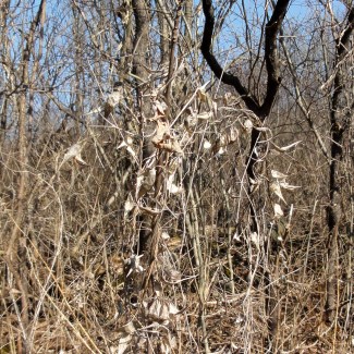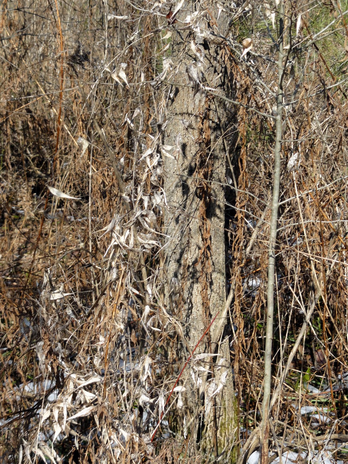 | Pale swallow-wort climbing pine and ash trees, near one of the rightmost (southern) pushpins in the map above, Feb. 17, 2012. | |