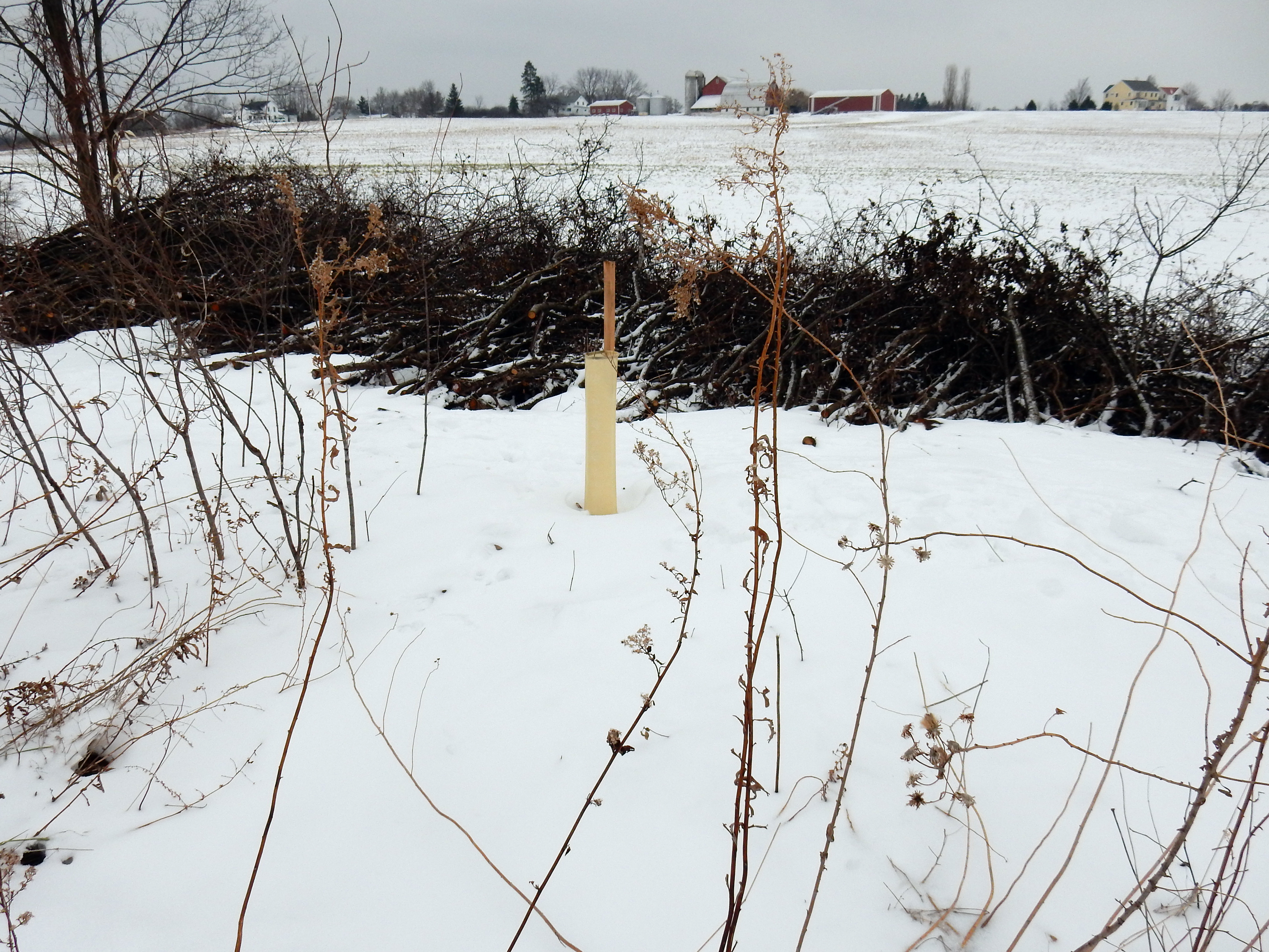 | Bur oak seedlings in tree shelters on the east side of Bill Pavlus Pond. Dec. 21, 2014. The brush pile behind is primarily buckthorn that had been remove from the location. | |