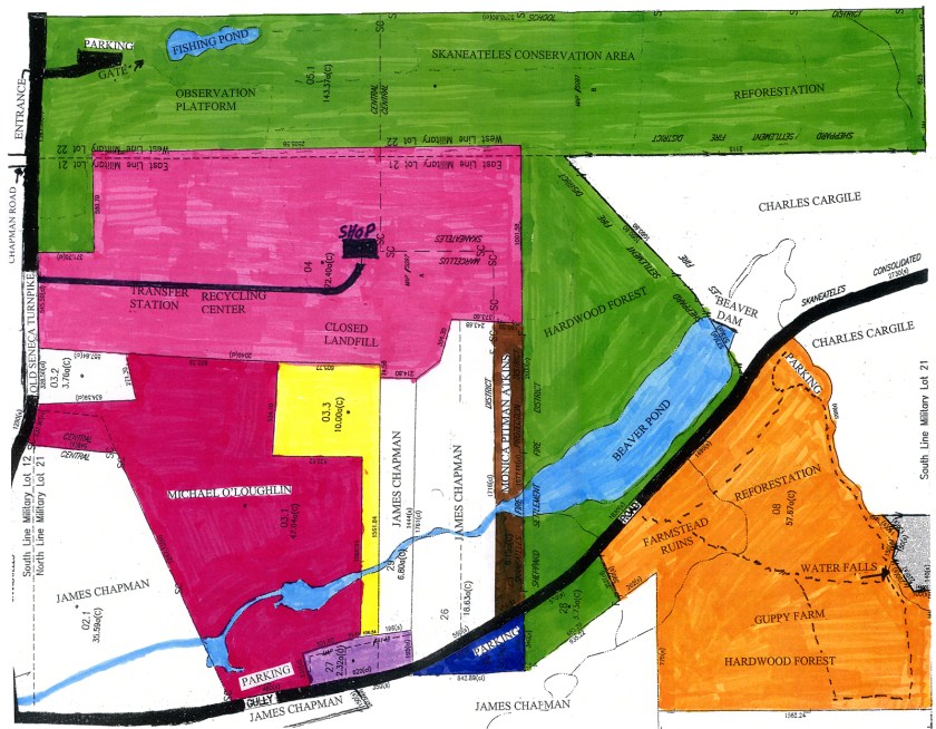 The Skaneateles Conservation Area is located south of Old Seneca Turnpike and along both sides of Gully Road in the area of the Beaver Pond. Including the Transfer Station this parcel contains 345.42 acres. Several different transactions have taken place to acquire this property. You have a color-coded map of the area on the opposite side. I will now walk you through the various acquisitions as listed in the Key on the right hand side of the map.