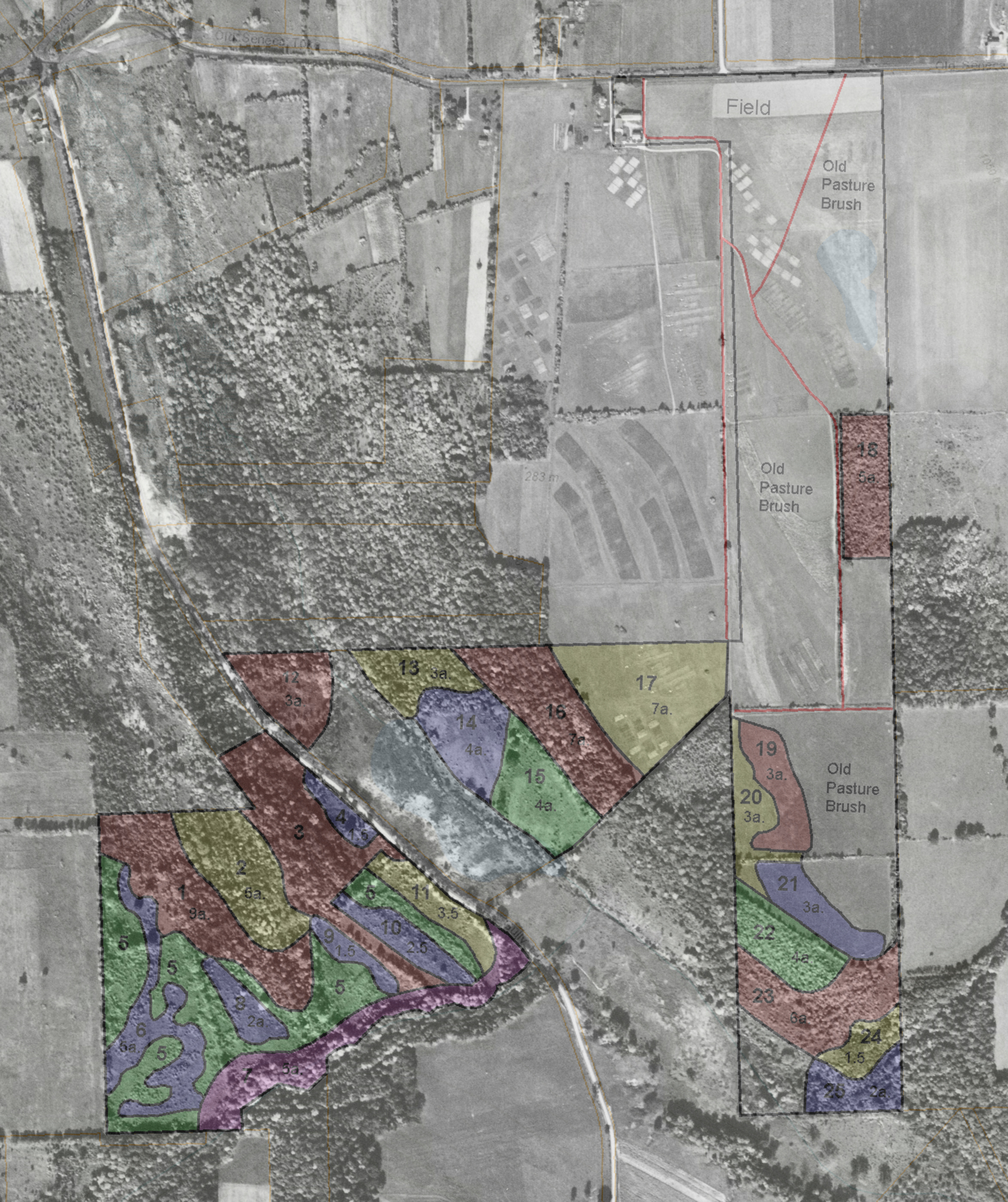 | 2002 tree survey overlaid onto 1951 aerial photo of the Federal Farm and Gully Road area. |