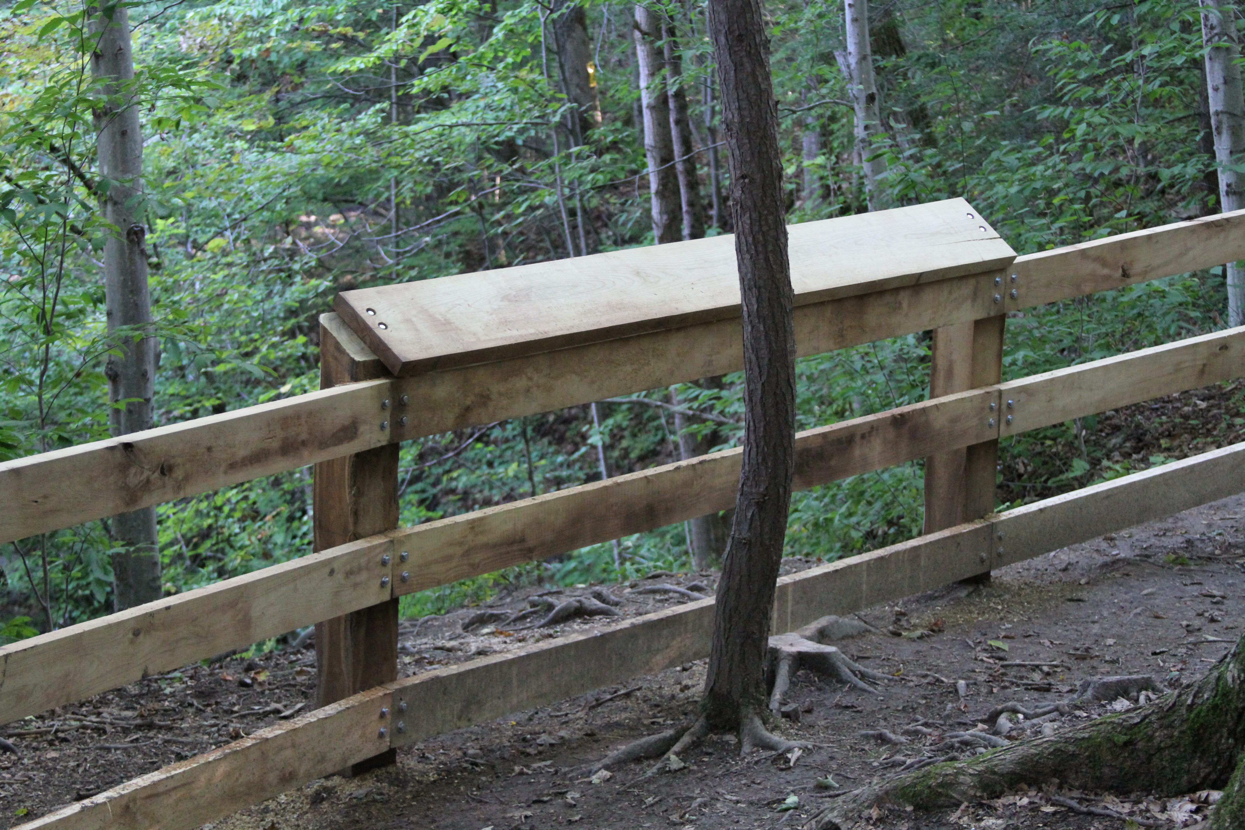 | The first of eight new railing posts to be installed by Matt and his crew from Marcellus Scout Troop 66. This one was was put in the ground on Saturday, August 15, 2015. Thank you all. |